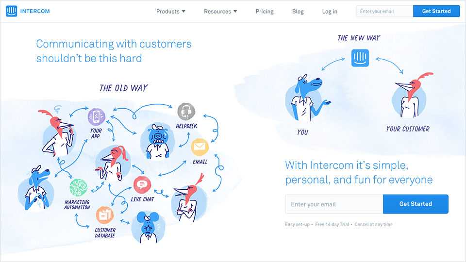 Intercom用生动的手绘风插画描绘了一副工作中遭遇的混乱场景,引出了使用Intercom可以结束这一切混乱的概念:
