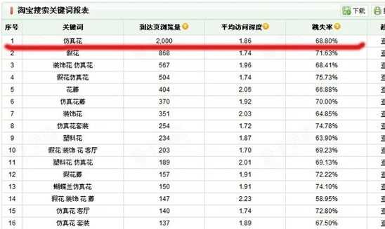 在上图中可以看出,仿真花的搜索人气丶访问深度和跳失率都是表现不错的,所以这个关键词就是店铺的核心关键词。