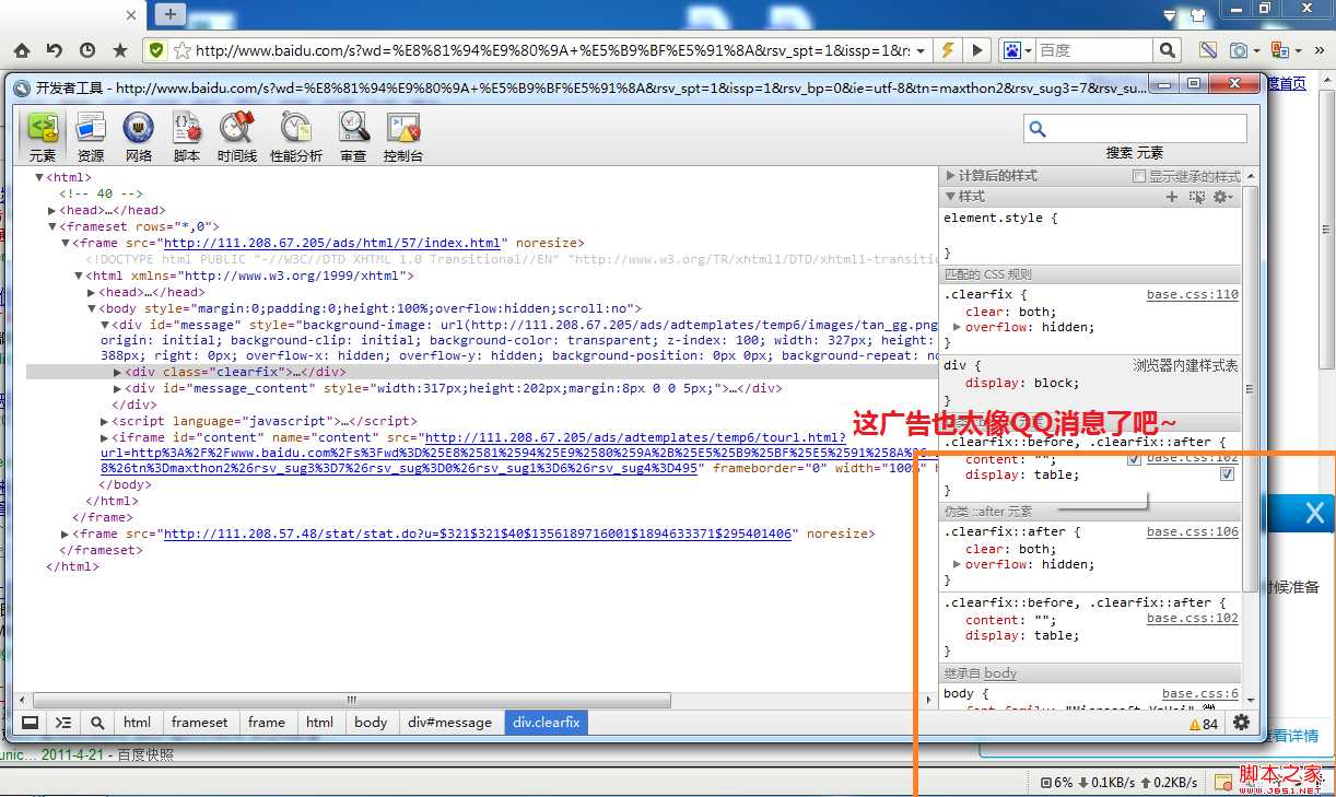 这招够狠,乍一看,还真以为是QQ之类的软件弹出的消息框呢。不过只要把浏览器窗口退出最大化,顺便再拖一下窗口,广告也跟着动起来了:)假李鬼就瞬间原形毕露了!