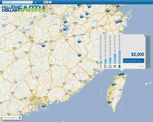 现在,出现的百万地球,也是同样由两个意想天开的年轻人所创建,有趣的是,整个网站就是用Google Map做的,他们选了全世界1000个城市出售,每一个城市都有一个价钱,总共价值是100万美元,你喜欢的话,只要出那个价钱,就可以买下该城市,那么你就成为该市的市长,还可以将你的Facebook粉丝专页、你的Twitter帐号、你的YouTube影片……放在该市的旗子下面,当其他地方的网友逛到百万地球的你的城市所在地,就会看到你这位市长的相关资讯!
